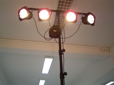 Für die kleine Bühne reichen unsere beiden Lichtstative mit je 4 PAR56 Scheinwerfern aus. Damit stehen 8 x 300 Watt mit wählbaren Farbfiltern zur Verfügung.